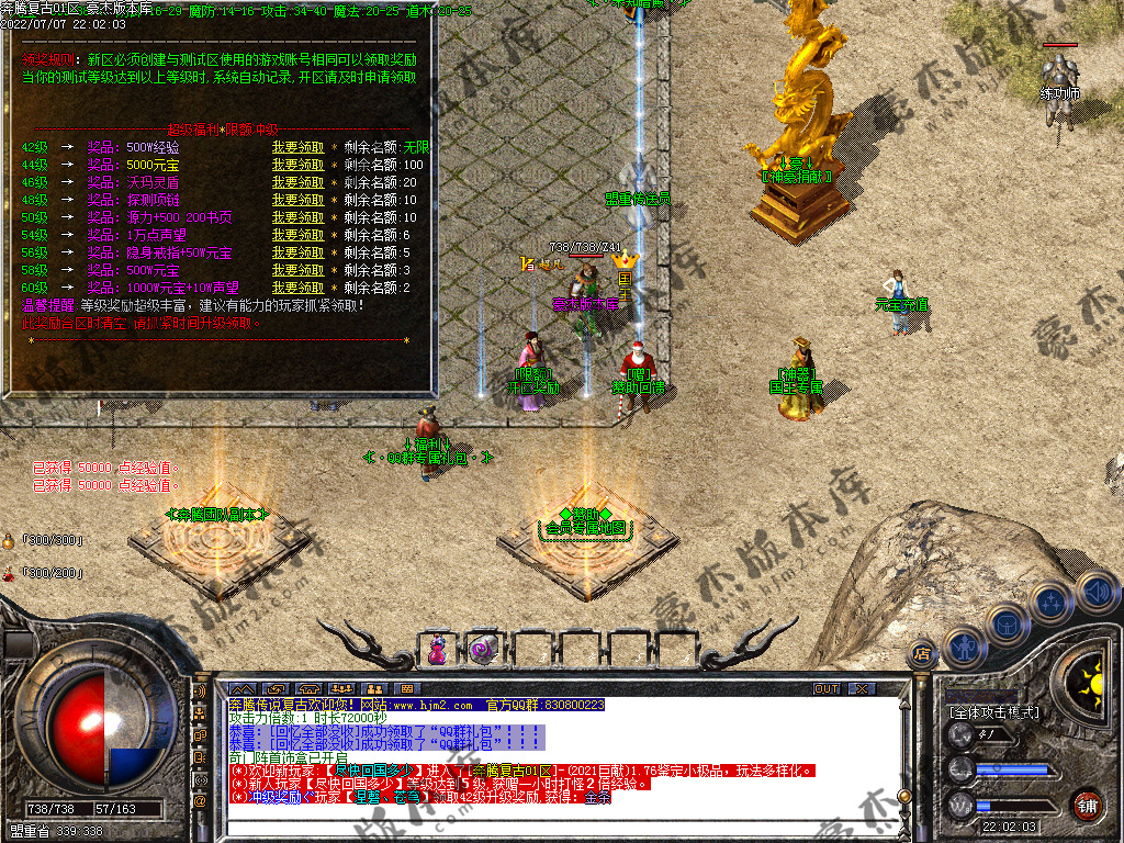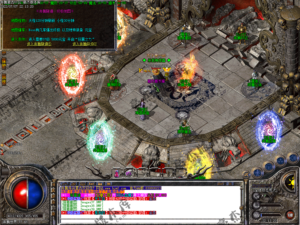 【奔腾复古】:★6:·开区介绍:·每天稳定开放三个区,第三天合区攻沙,奖励超厚奖励,详细奖励,进游戏观看!