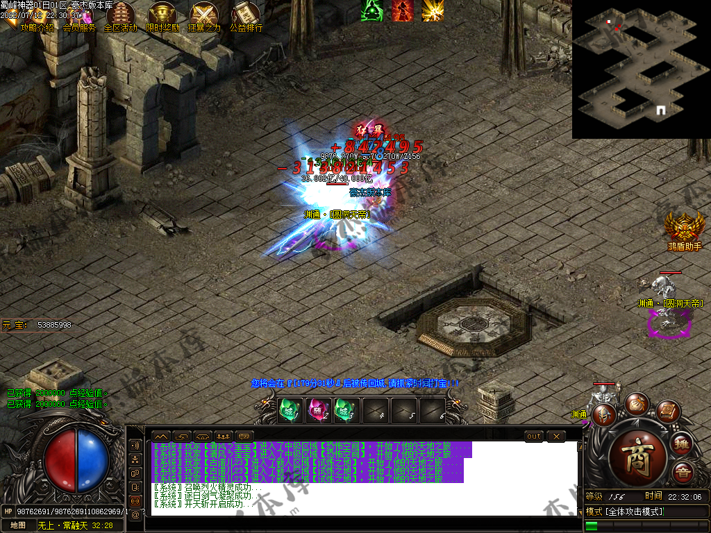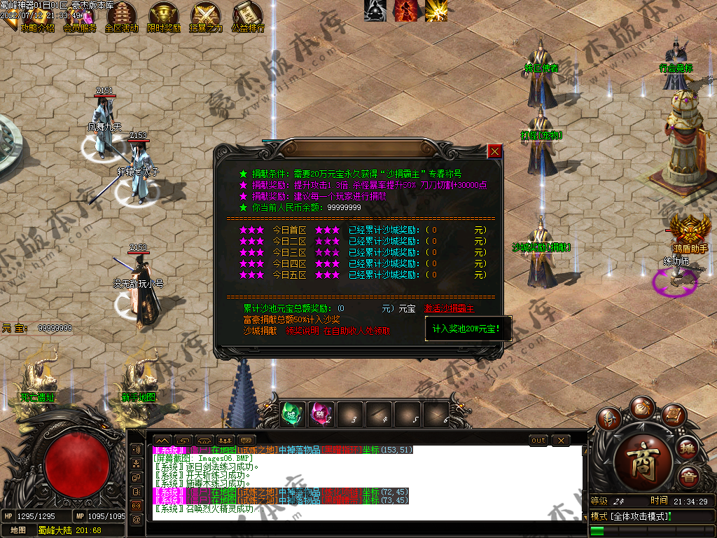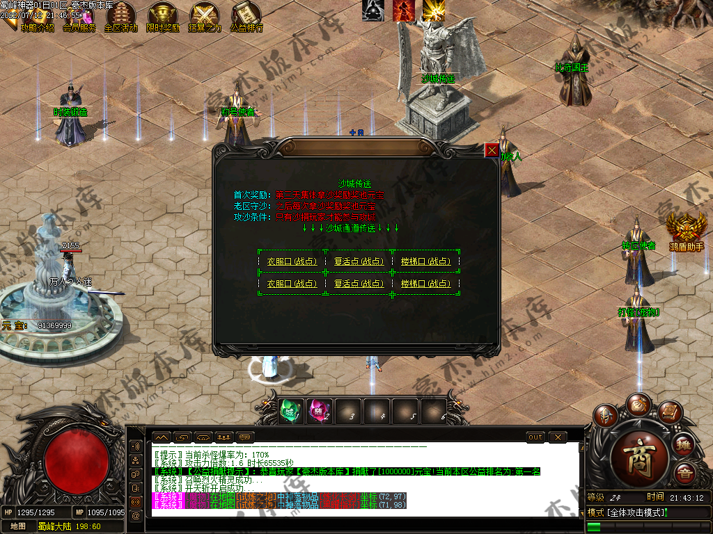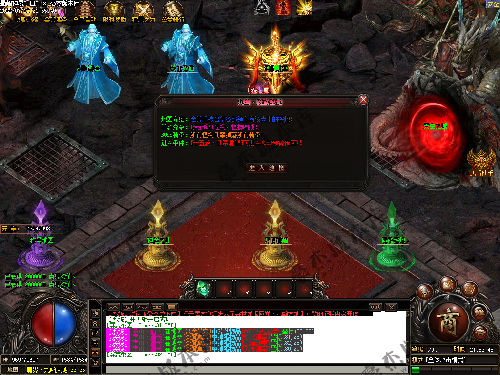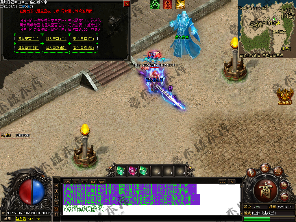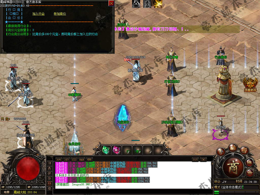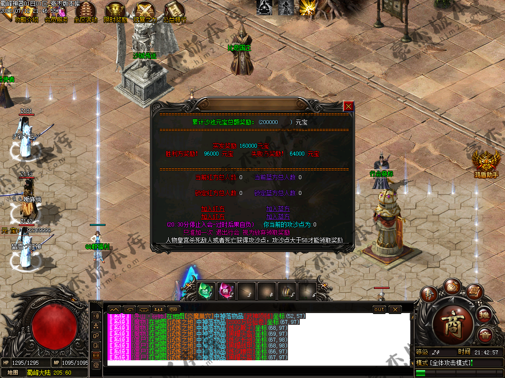 本服攻城自动设置了蓝方红方,请勿错过入会时间,禁止自建行会攻城,攻城结束达到条件的玩家在NPC处自动领取奖励。