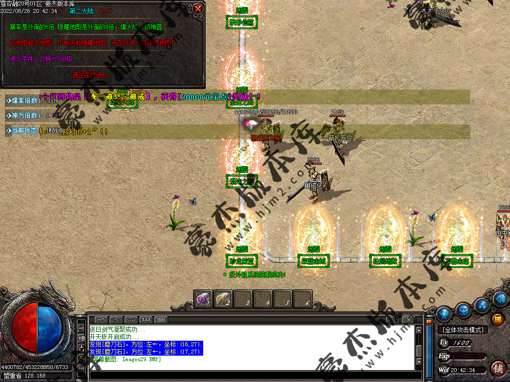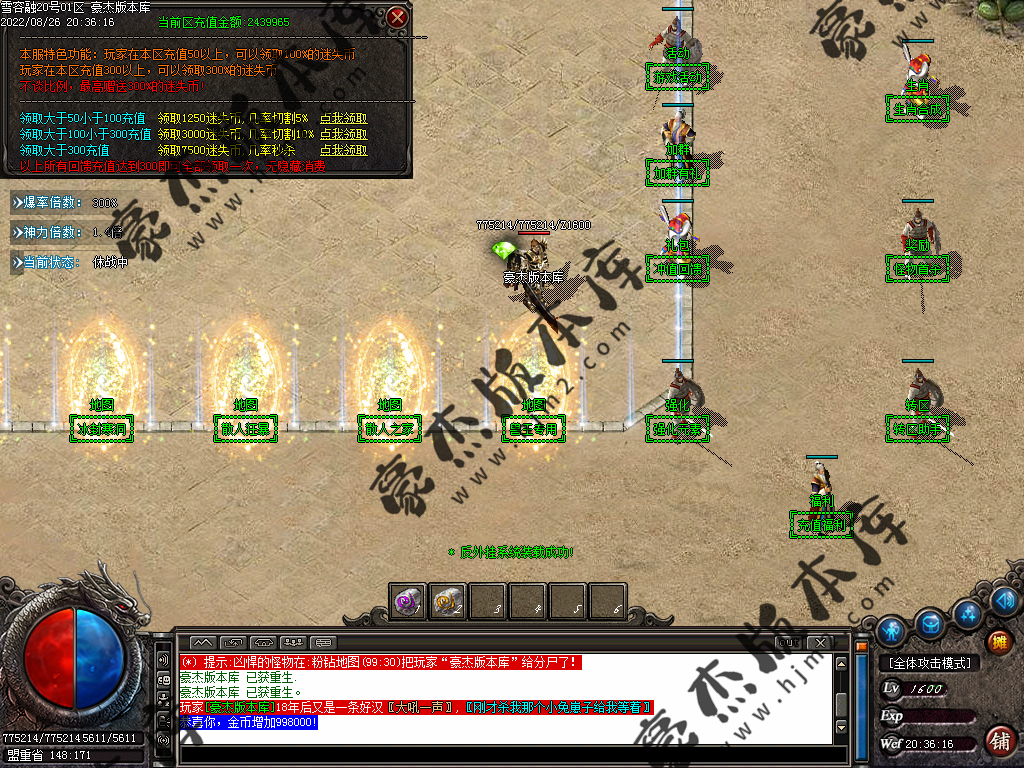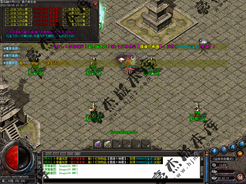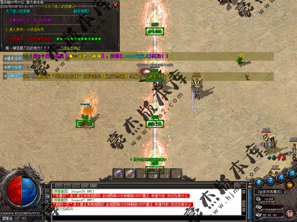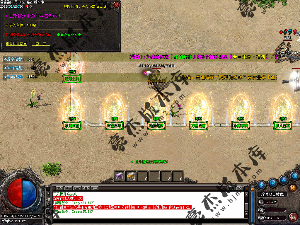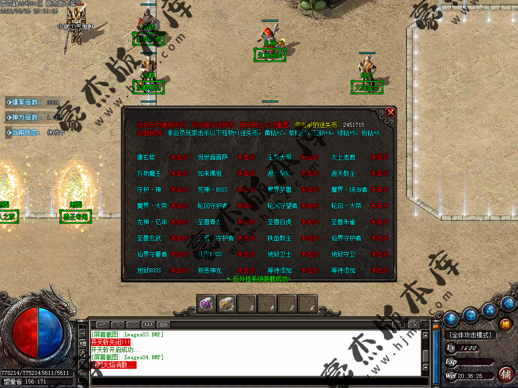 5.散人玩家优先打出一级会员,首爆(元宝) 首杀(迷失币) 迷失币可以兑换全服所有货币