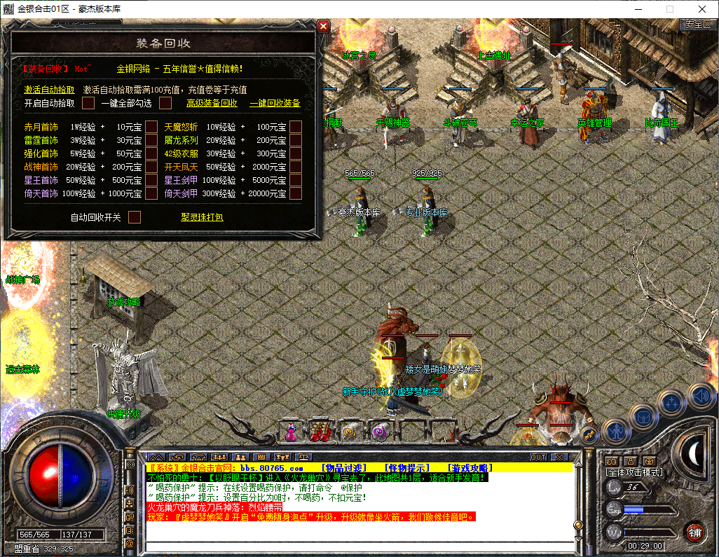 中等玩法:充值100,装备回收NPC上,即可开启自动泡点,自动回收【游戏理打出来的充值卷.累计到100也可开启】,一样边泡点,边吃珠子升级