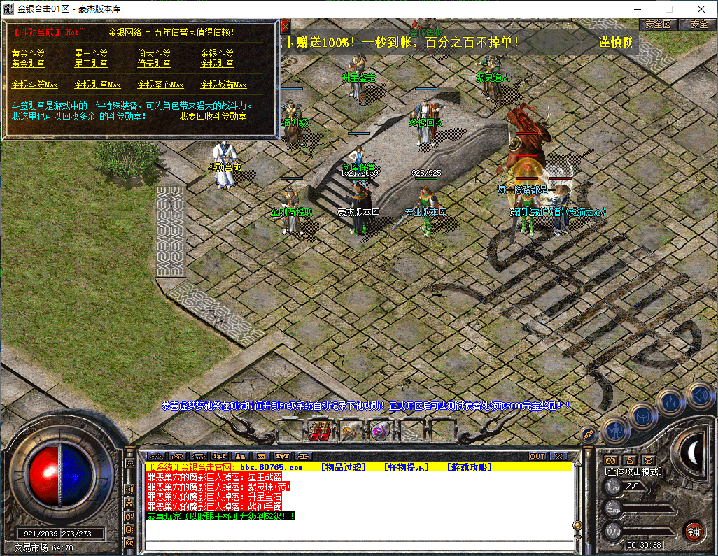 刷怪地图推荐:赞助福利(双倍爆率)、金银宝塔(综合)、财富广场(所有BOSS)、高级地图。