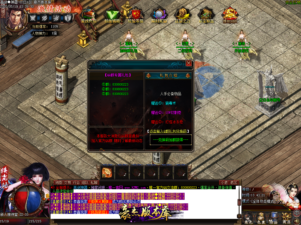 上线领取加群礼包,赠送施毒术+10W切割卷+刀刀冰冻卷。