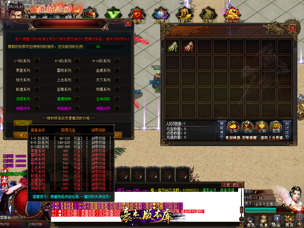 本服特色二:本服适合中等玩家[500-2000充值能力],即可无忧回本,还可无限激情,自动捡物,自动回收,安全无痛苦!