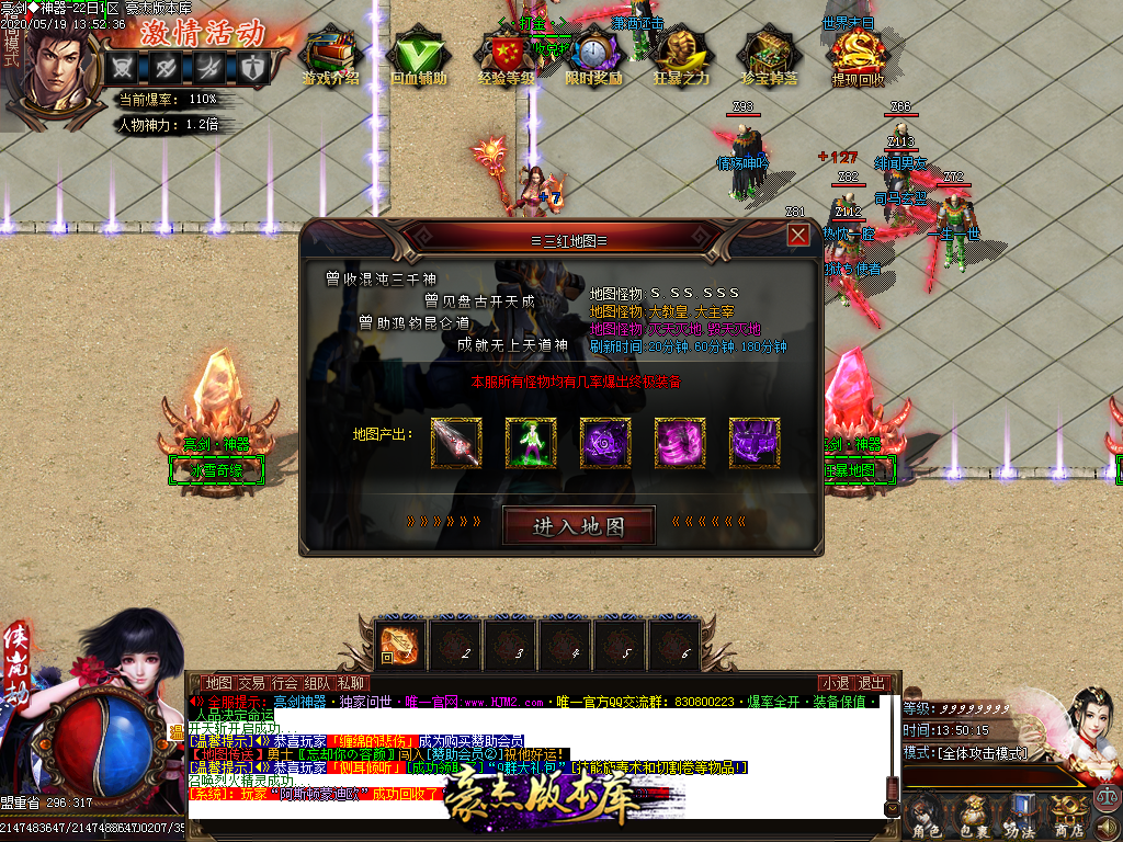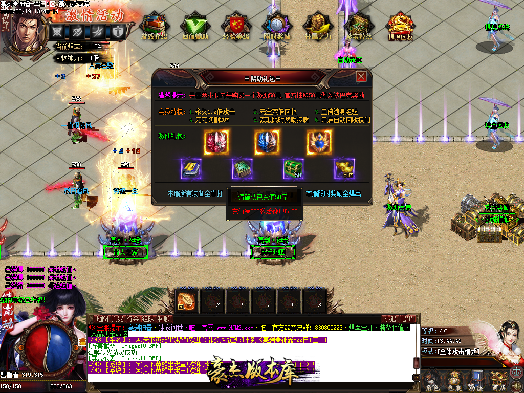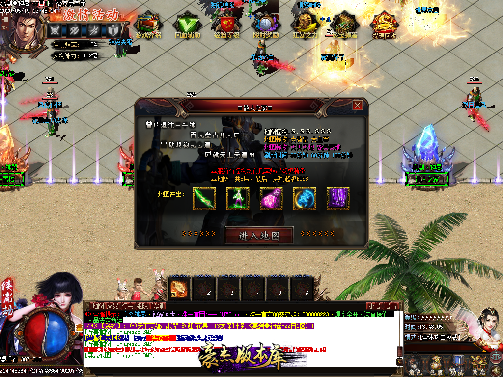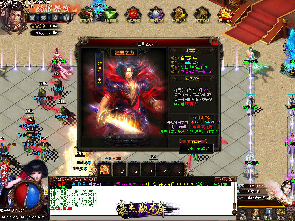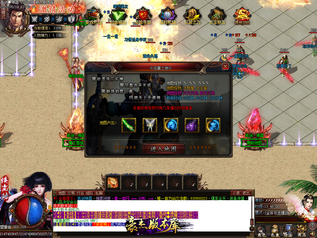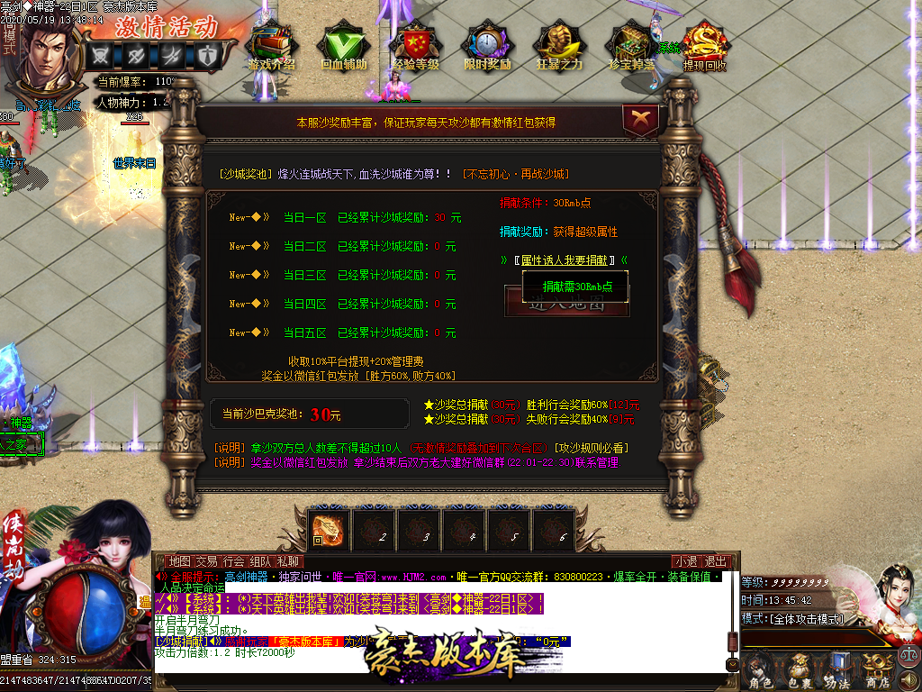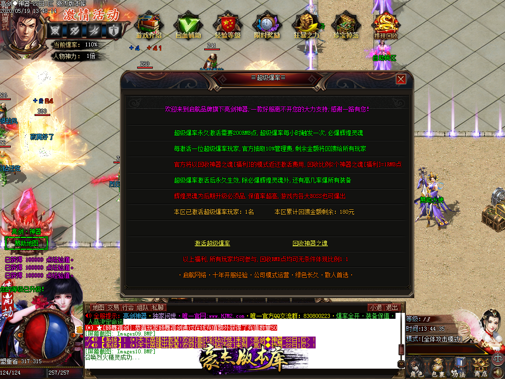充值240RMB,200RMB开通超级爆率,超级爆率激活还可以回收神器之魂,脸好一波29阶直接上天!花40元开启狂暴/沙捐,全服任你遨游!