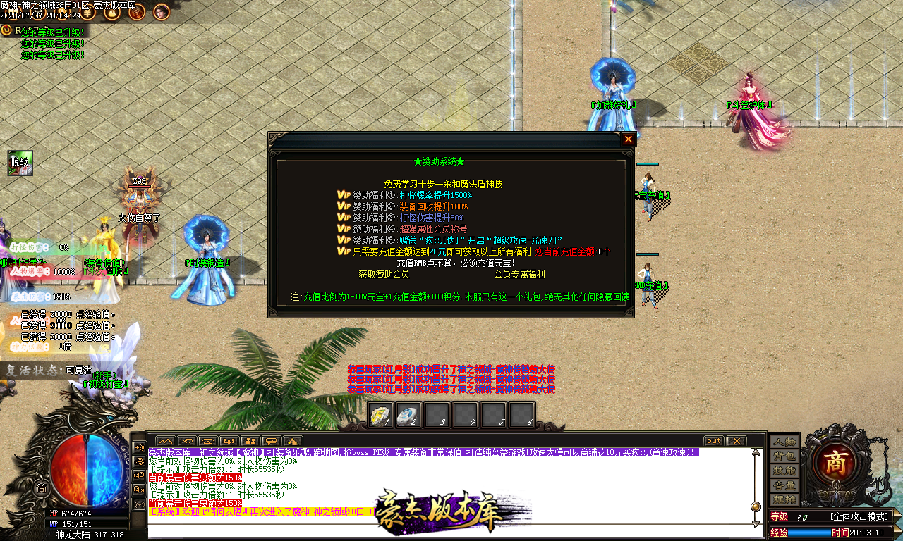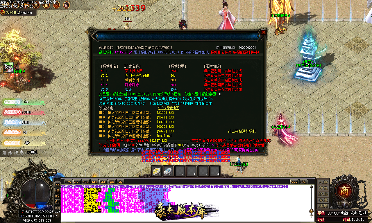 ★★充值玩家攻略★★: ★30元沙捐献★ (爆率提升3000%,打怪伤害50%,攻击提升10%,生命值+10%,半月技能,群毒。 送+9套)
