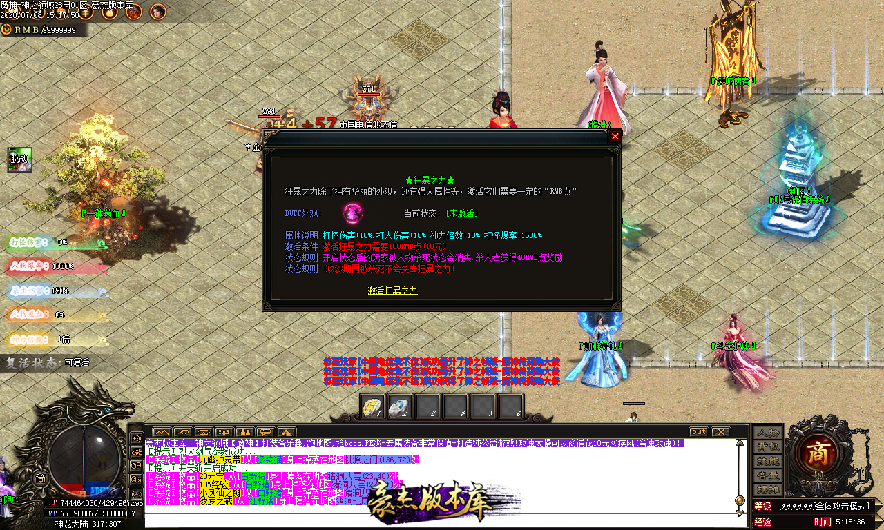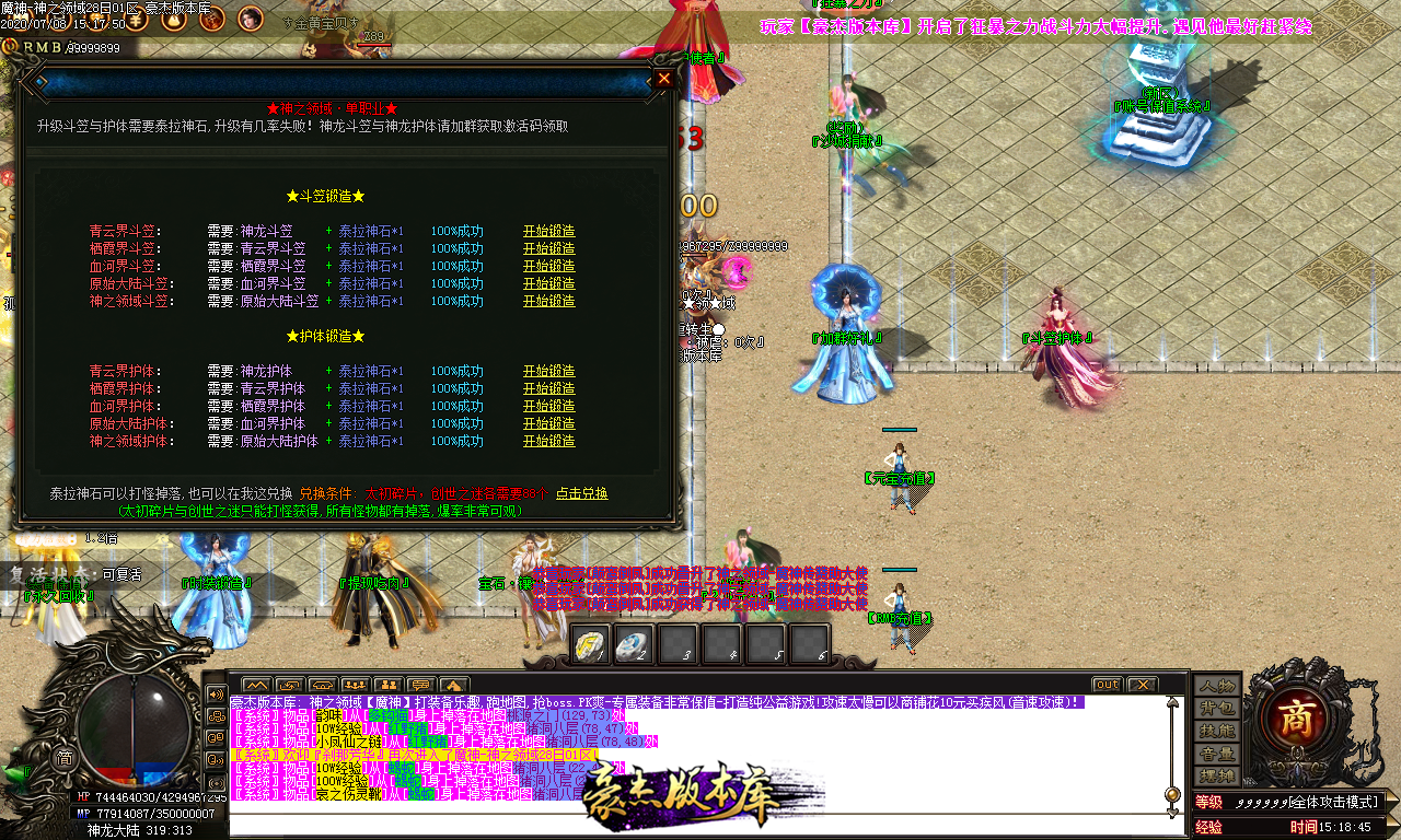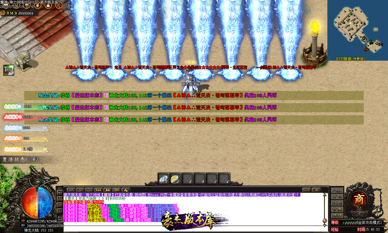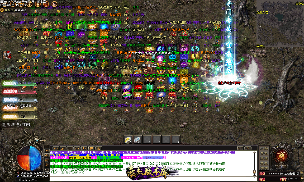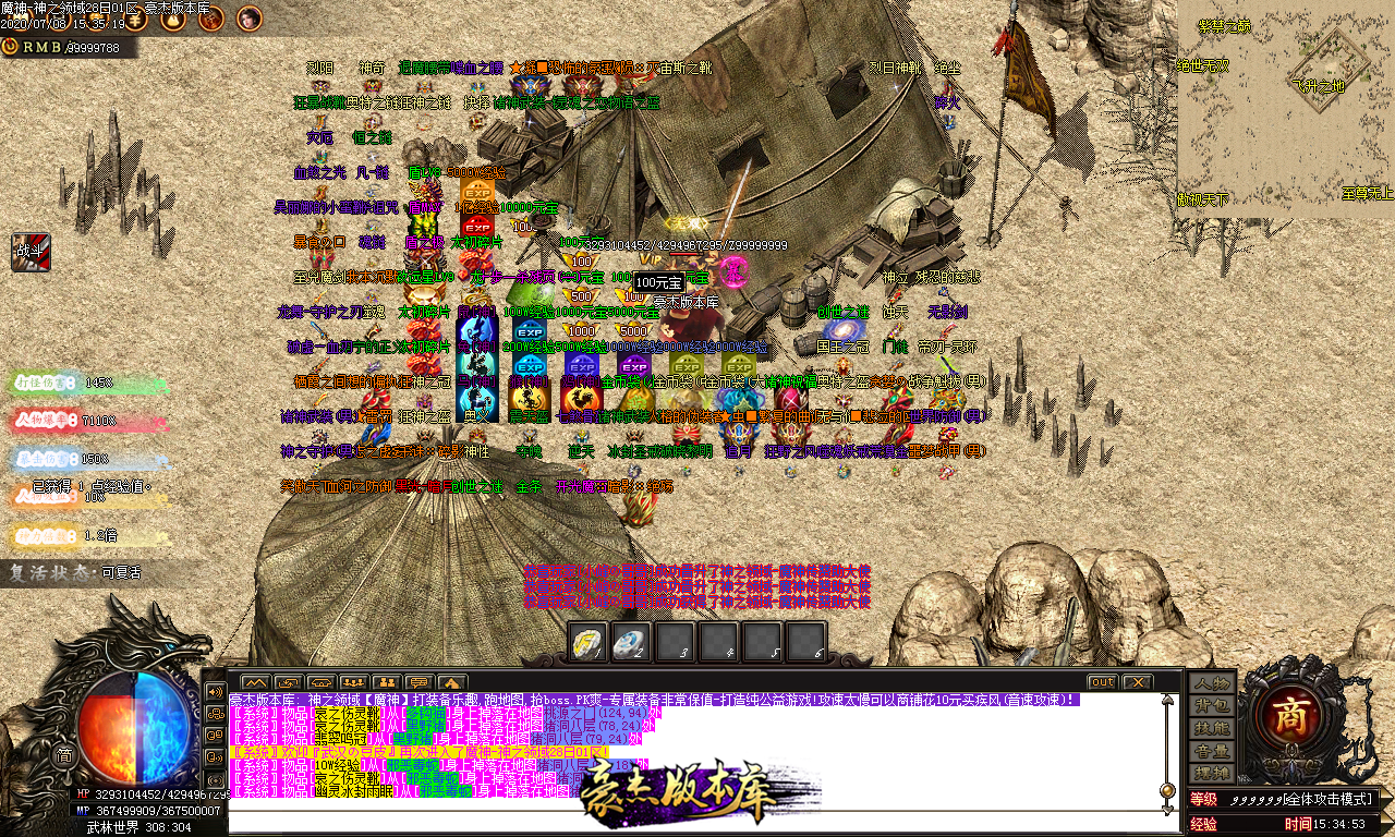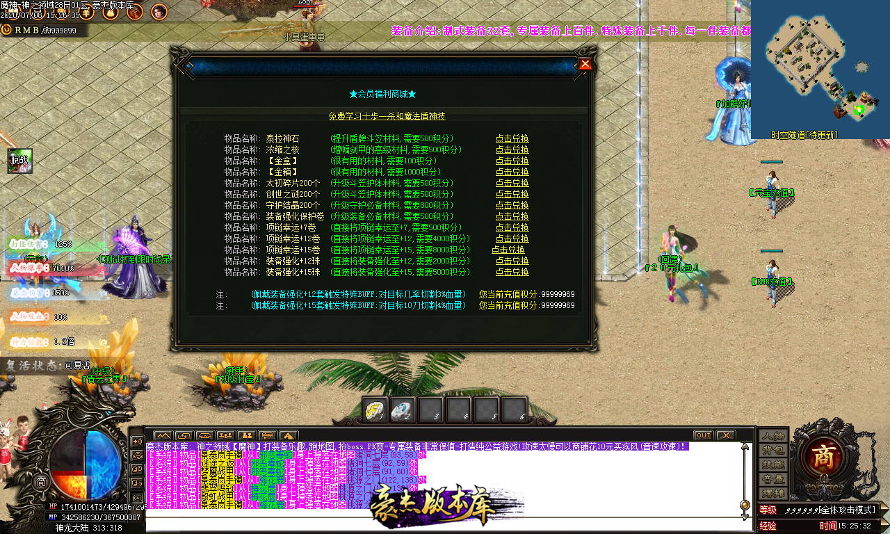 全身强化15星触发最大生命值 + 100% 打怪伤害 + 800%+5%几率切割 (20元回馈NPC,领取之后。积分兑换,500块元宝充值兑换一套)