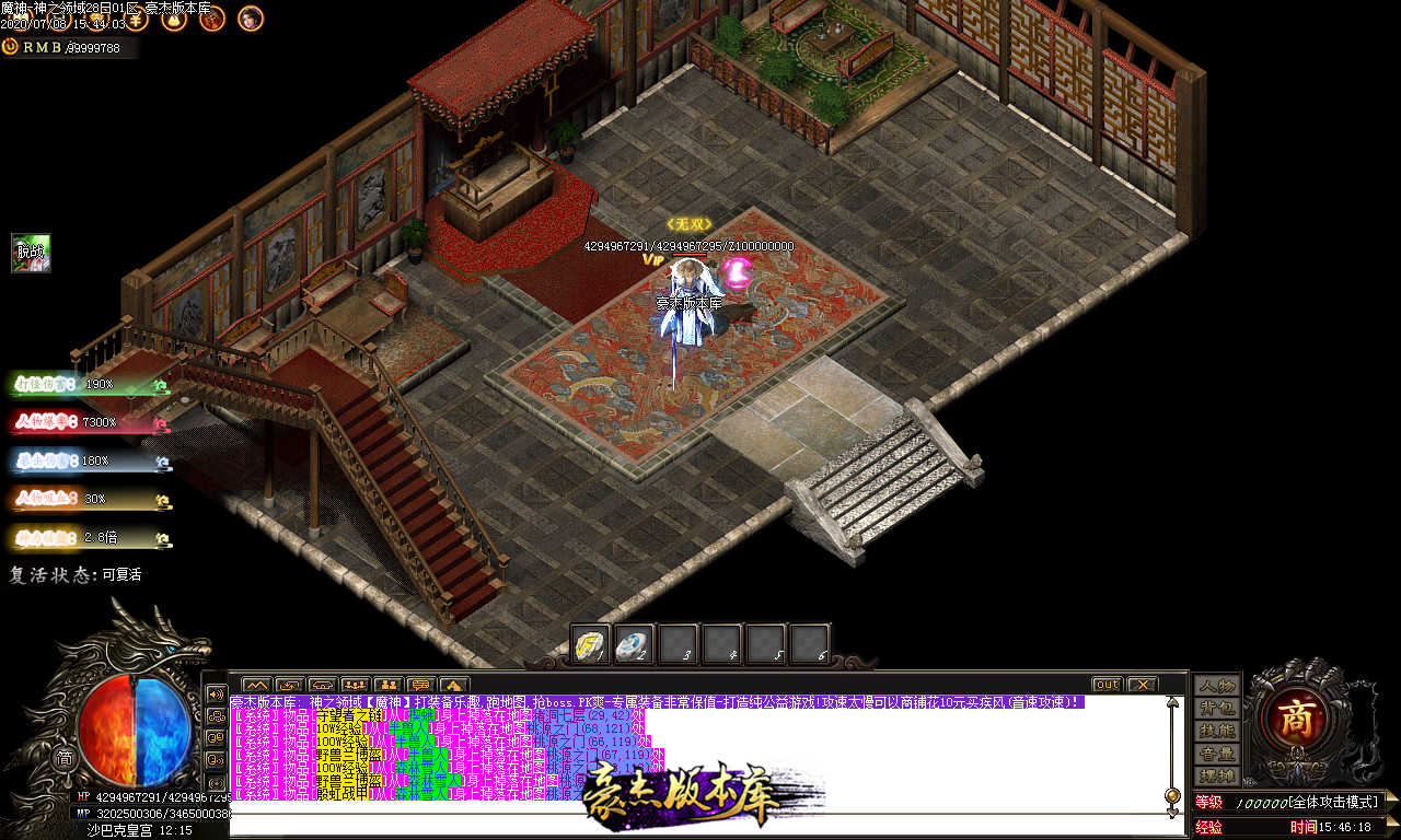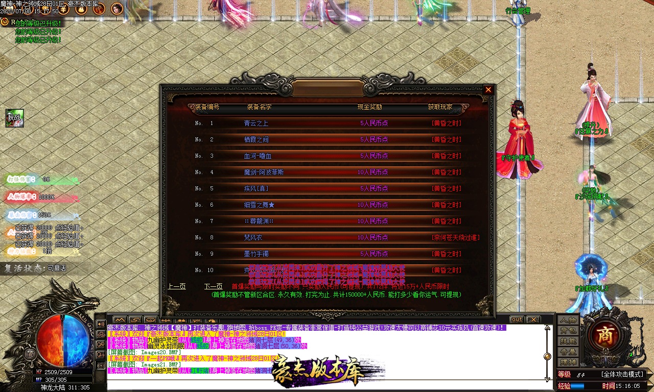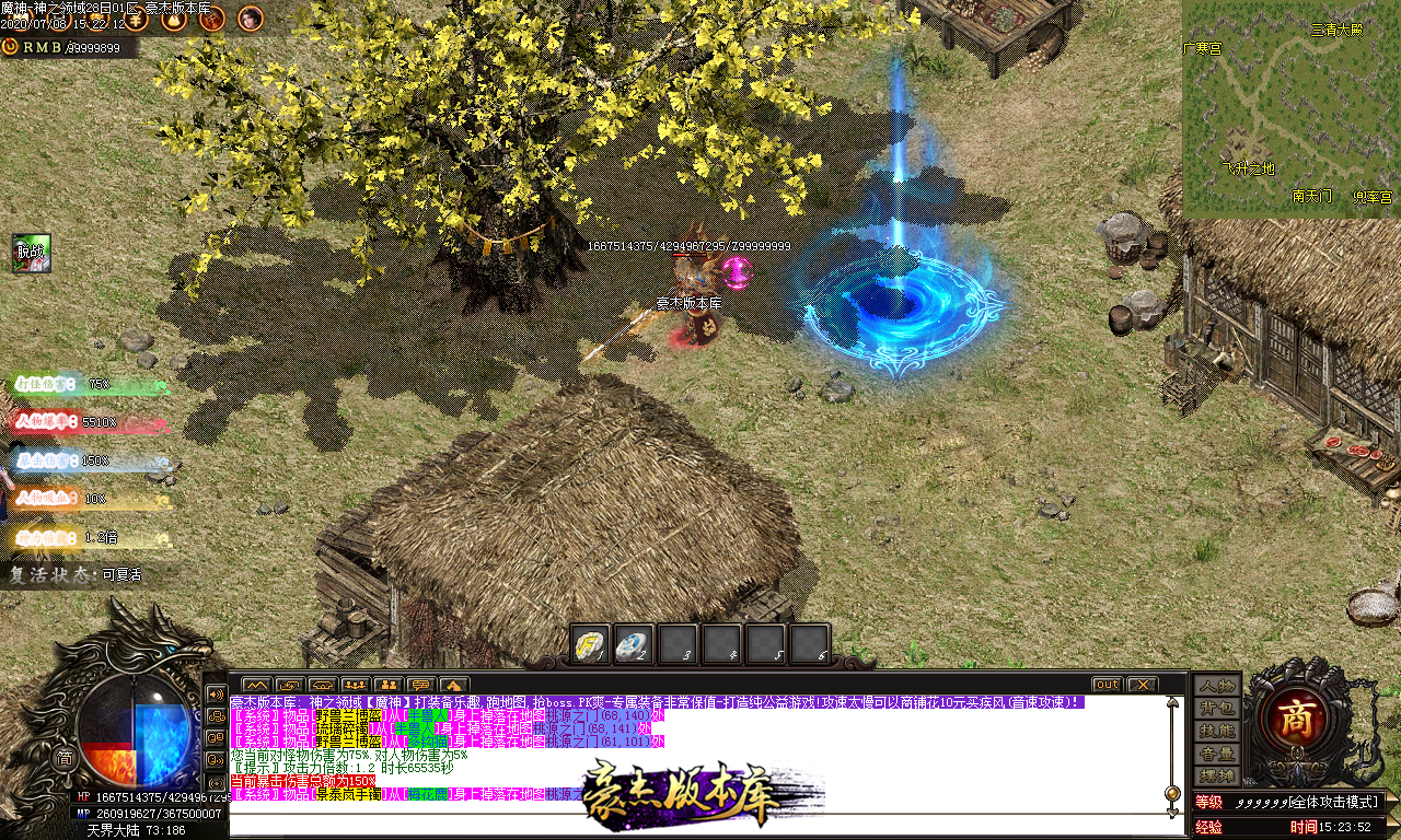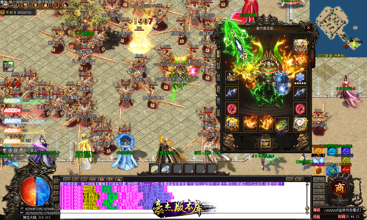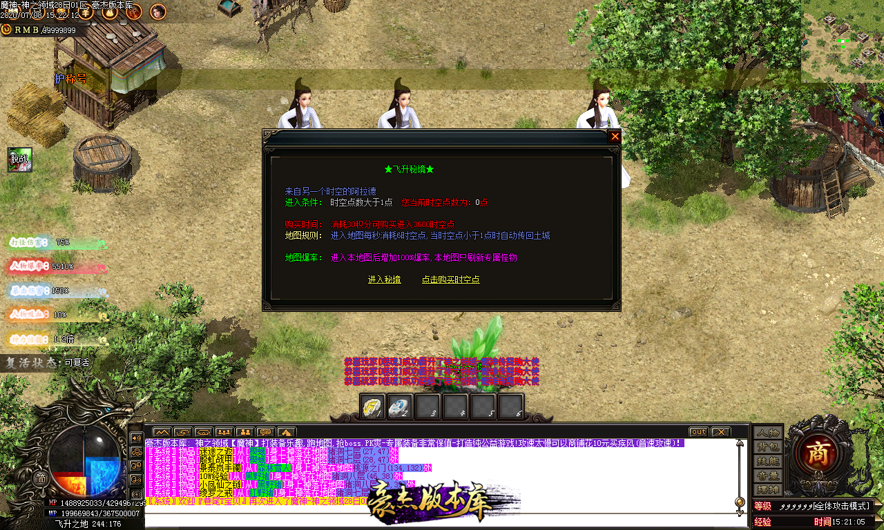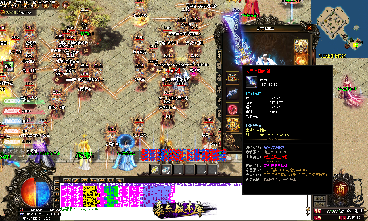 全身强化15星触发最大生命值 + 100% 打怪伤害 + 800%+5%几率切割 (20元回馈NPC,领取之后。积分兑换,500块元宝充值兑换一套)