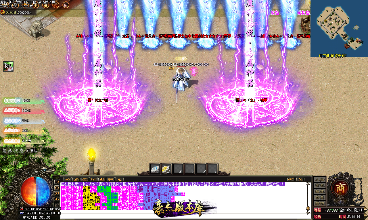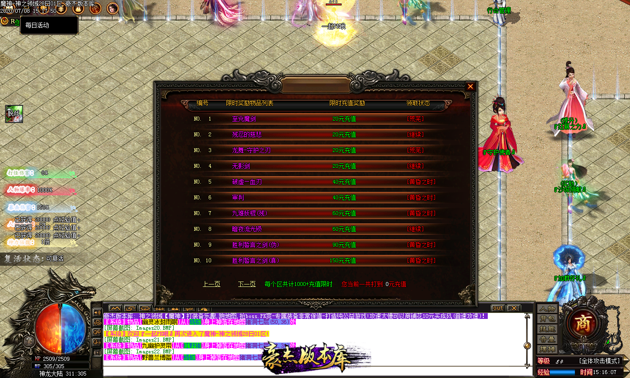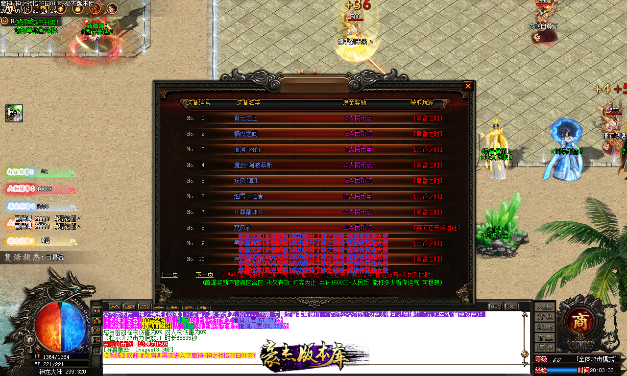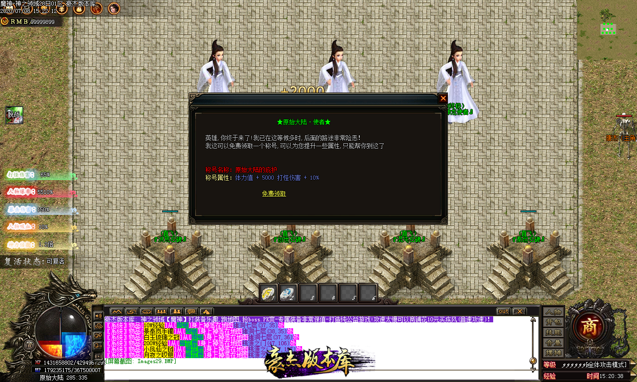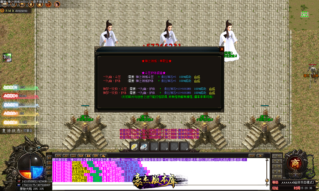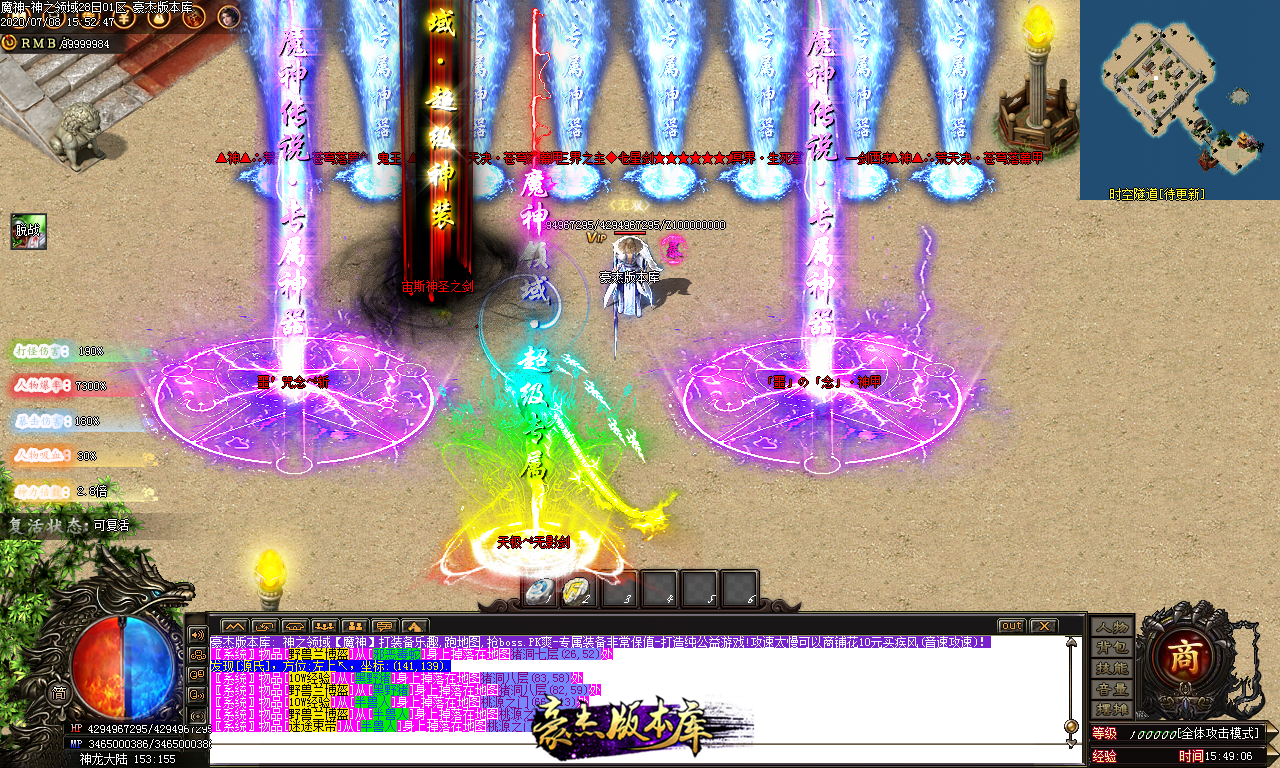 全身强化15星触发最大生命值 + 100% 打怪伤害 + 800%+5%几率切割 (20元回馈NPC,领取之后。积分兑换,500块元宝充值兑换一套)