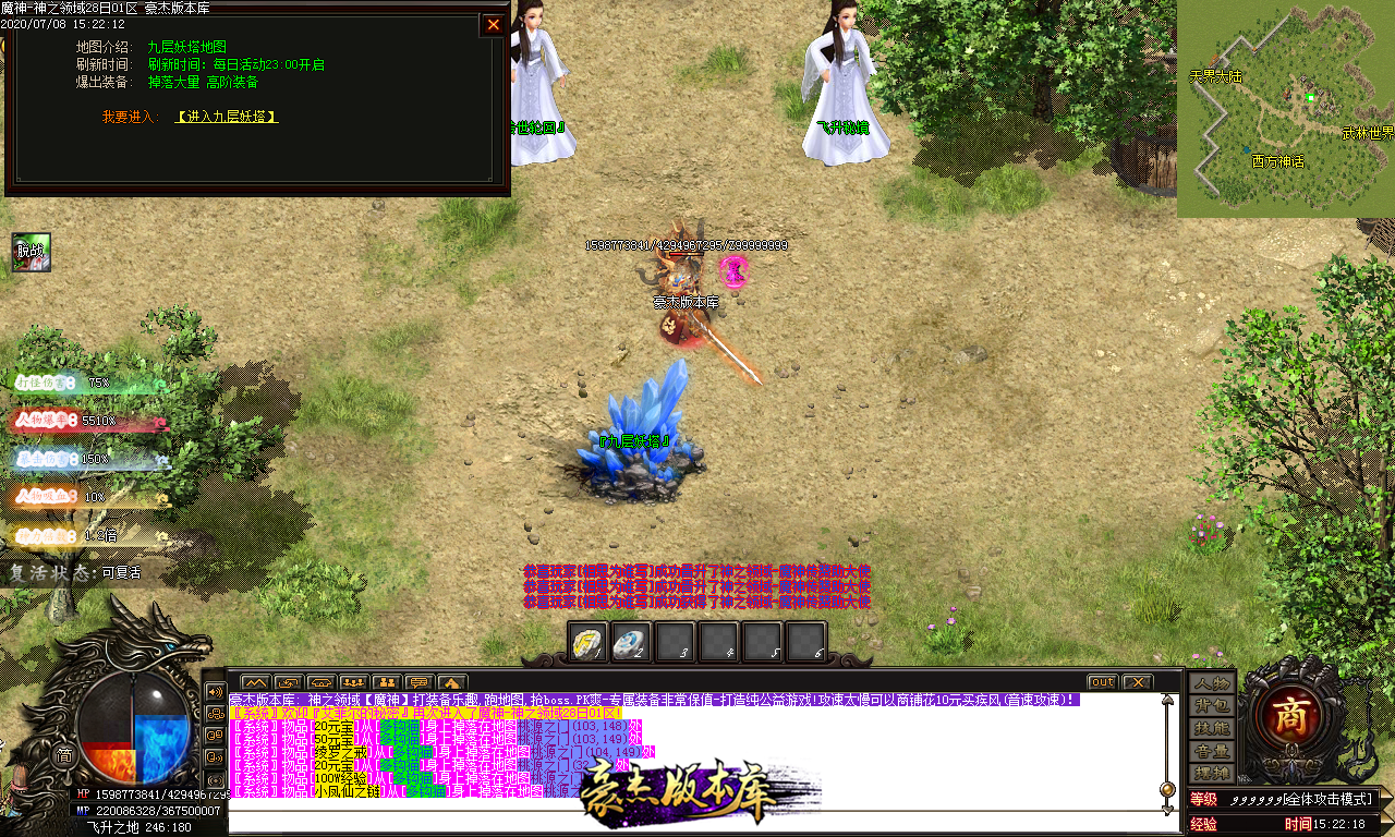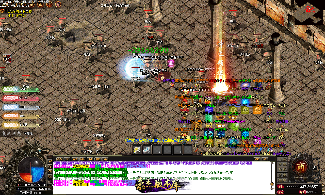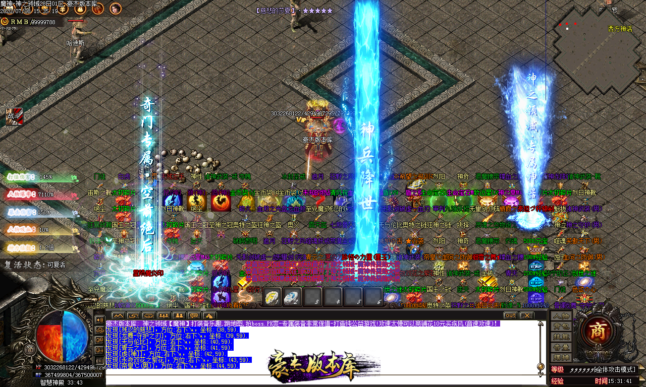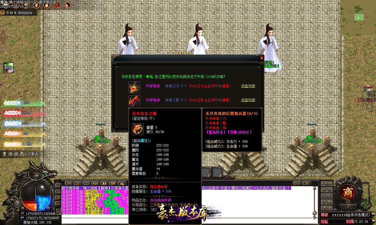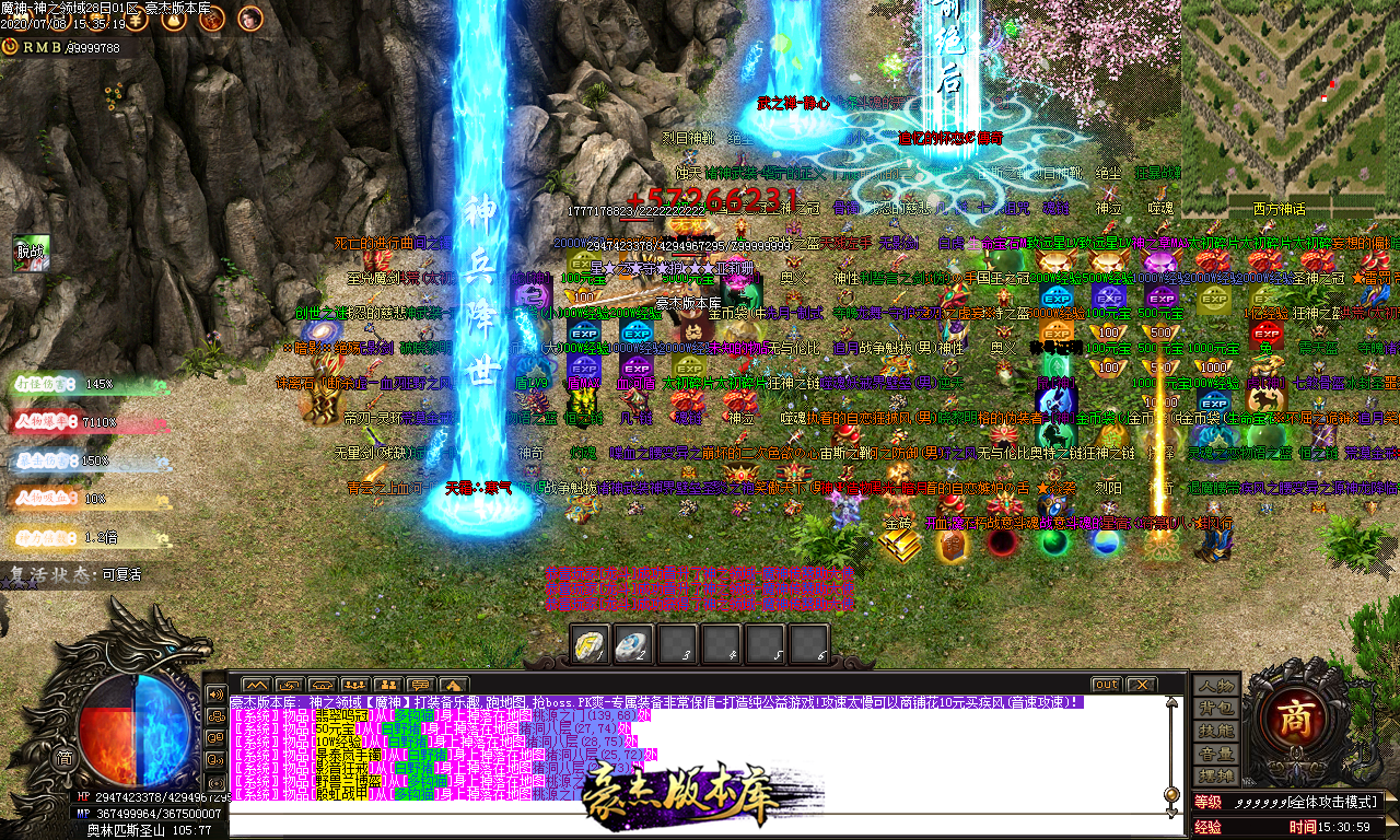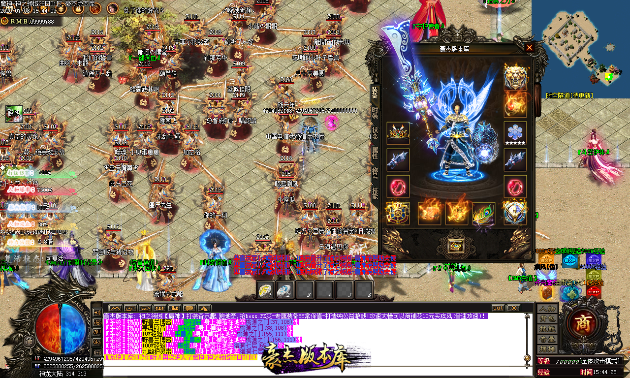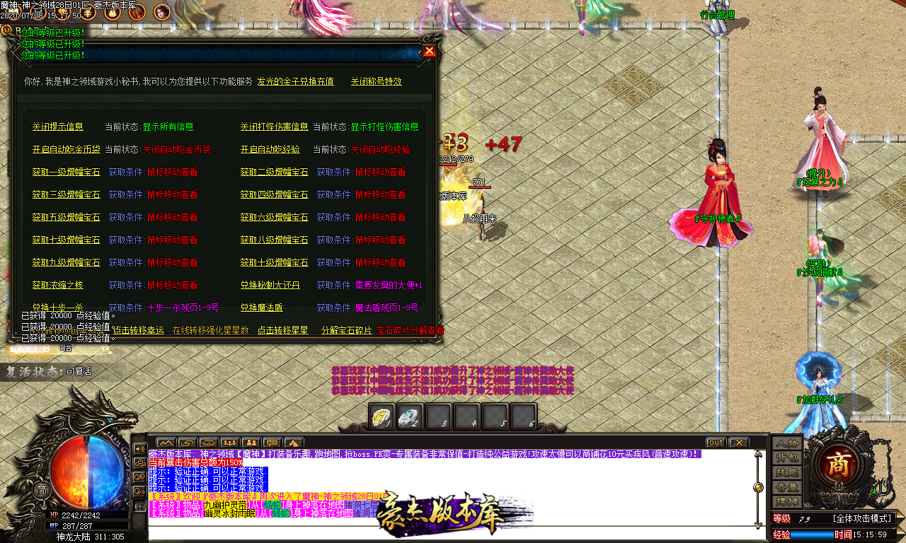 全身强化15星触发最大生命值 + 100% 打怪伤害 + 800%+5%几率切割 (20元回馈NPC,领取之后。积分兑换,500块元宝充值兑换一套)
