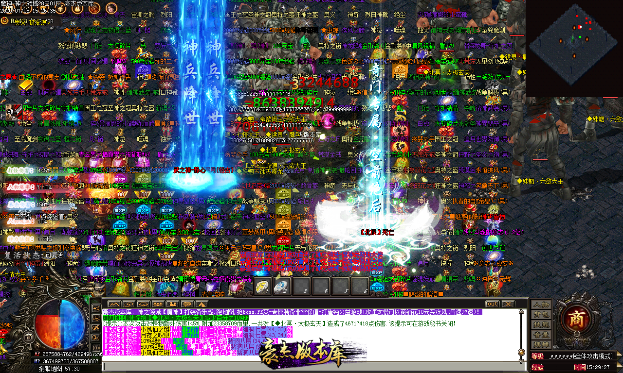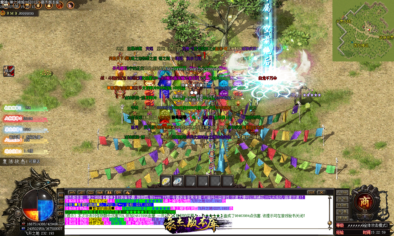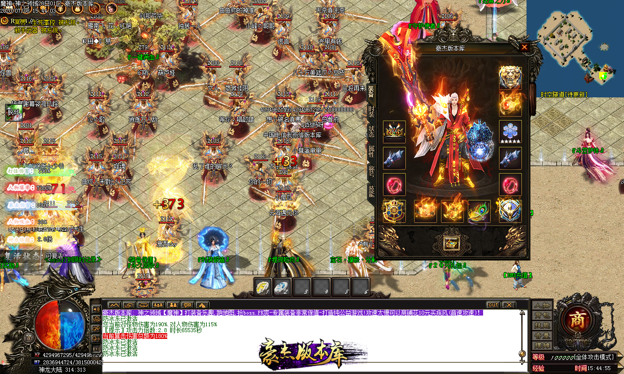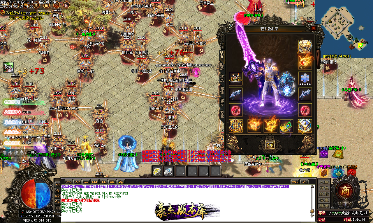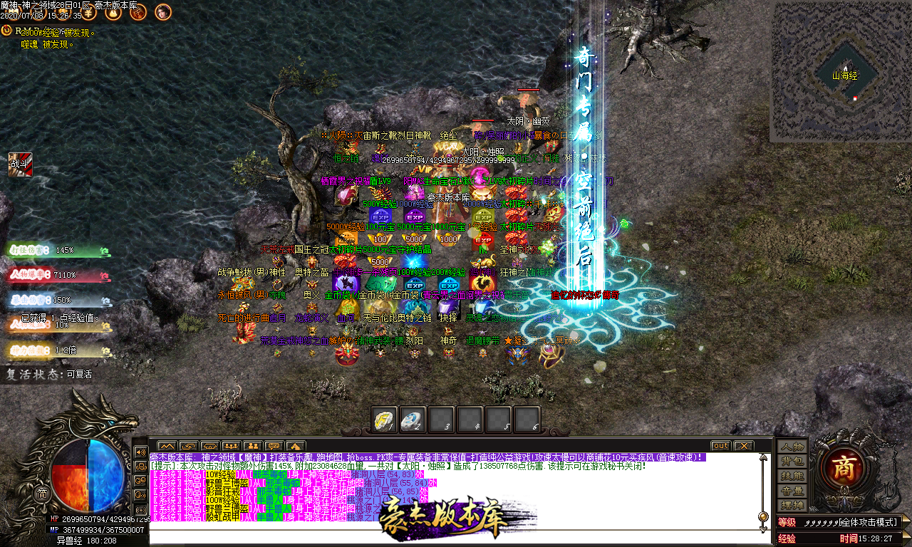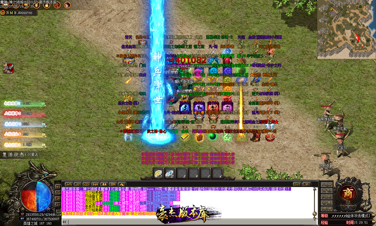 全身强化15星触发最大生命值 + 100% 打怪伤害 + 800%+5%几率切割 (20元回馈NPC,领取之后。积分兑换,500块元宝充值兑换一套)