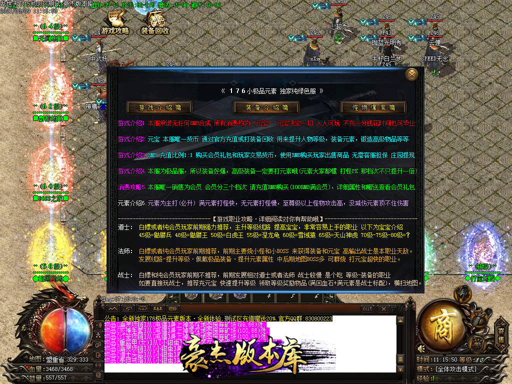 游戏介绍4.本服为极品服,所以装备好爆,高级装备一定要打元素哦(元素大家都懂 打怪PK 那档次不只提升一倍)