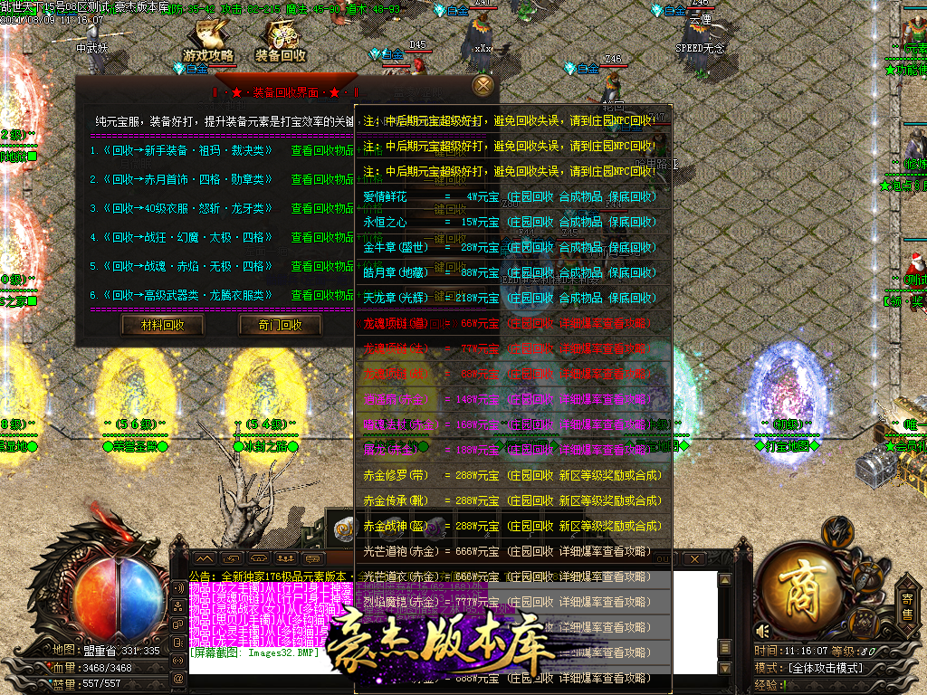 游戏介绍2.元宝 本服唯一货币 通过官方充值或打装备回收 用来提升人物等级,装备元素,锻造高级物品等等