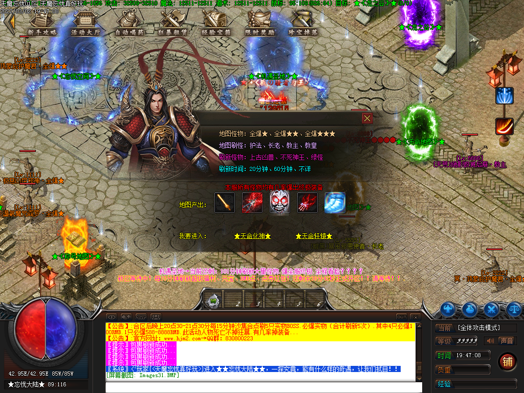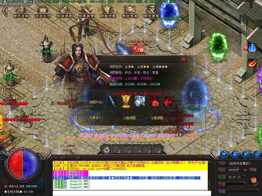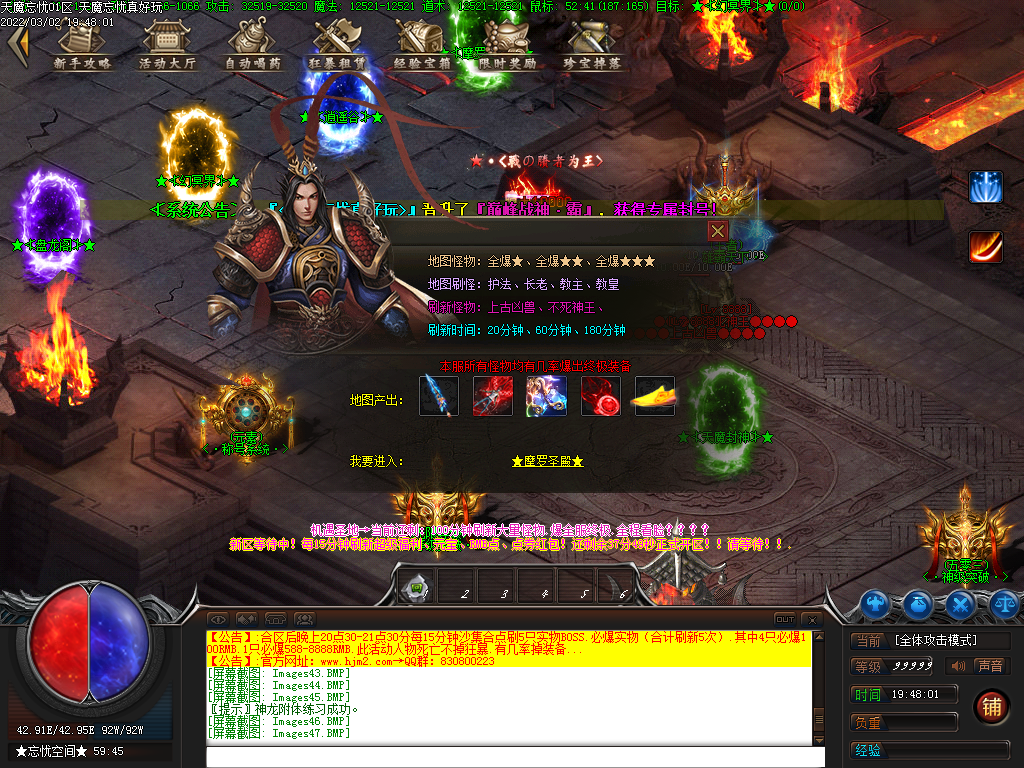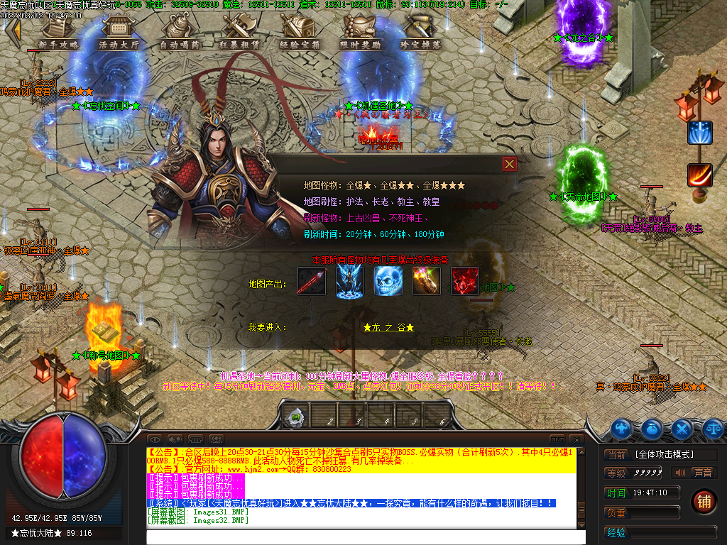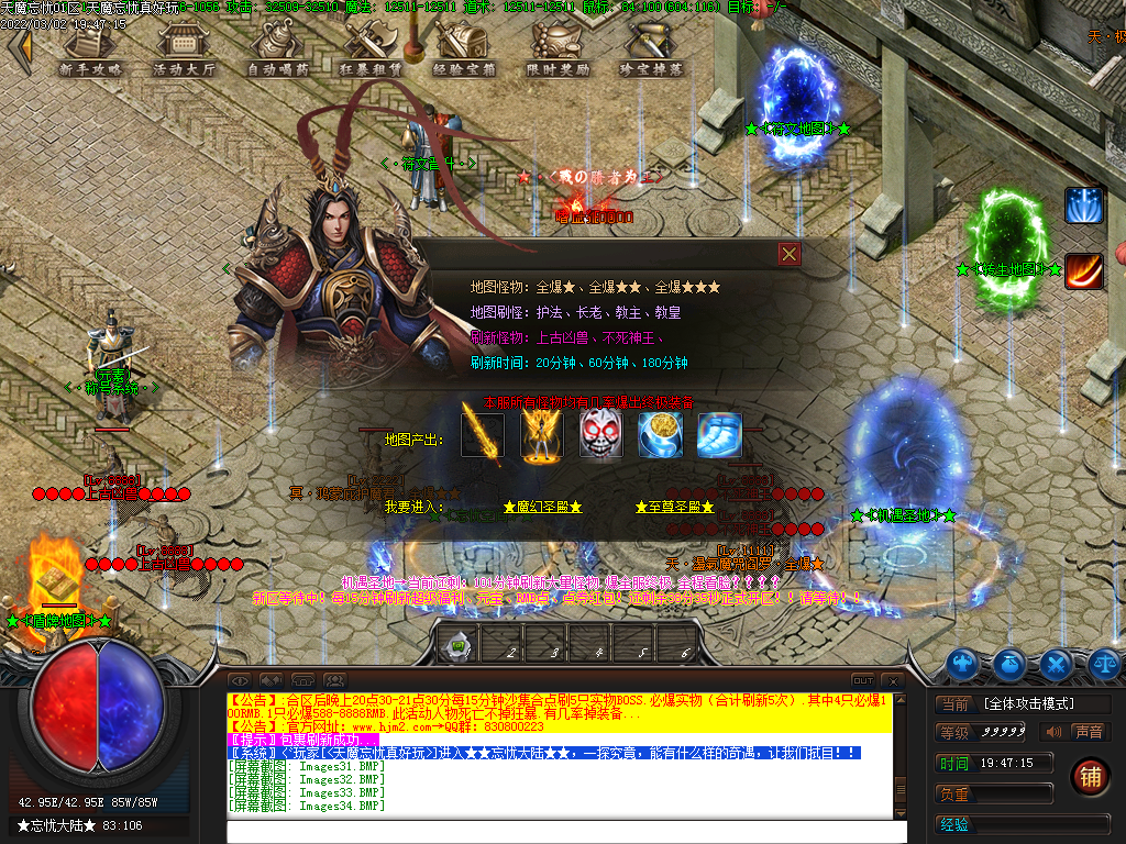 全服刷新④ → ●●●上古凶兽●●● ●●●不死神王●●●/FCOLOR=249> 时间:60分钟