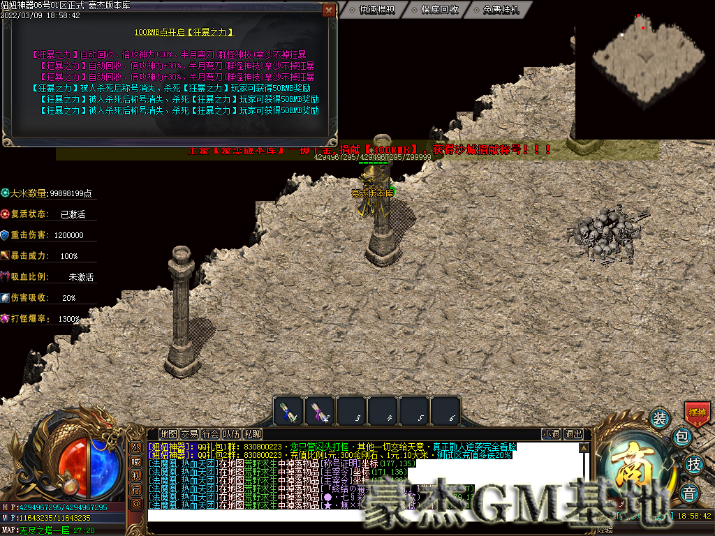 上线充值40米的RMB点,开启捐献狂暴,狂暴带自动回收,捐献刀刀切割怪物30W,并且增加爆率,还附带捐献狂暴
